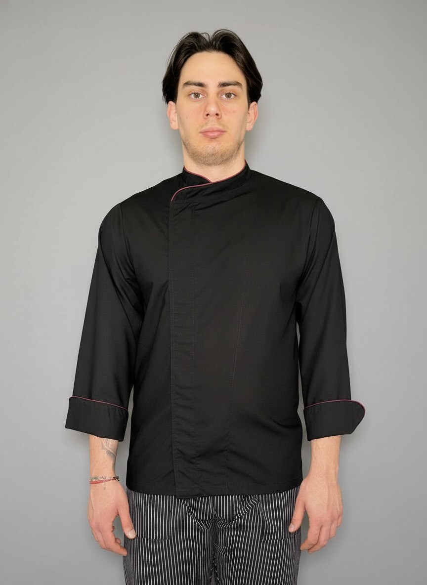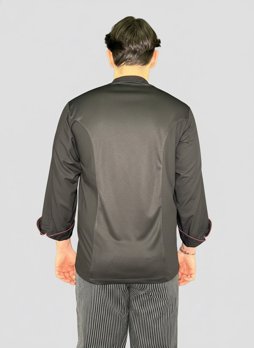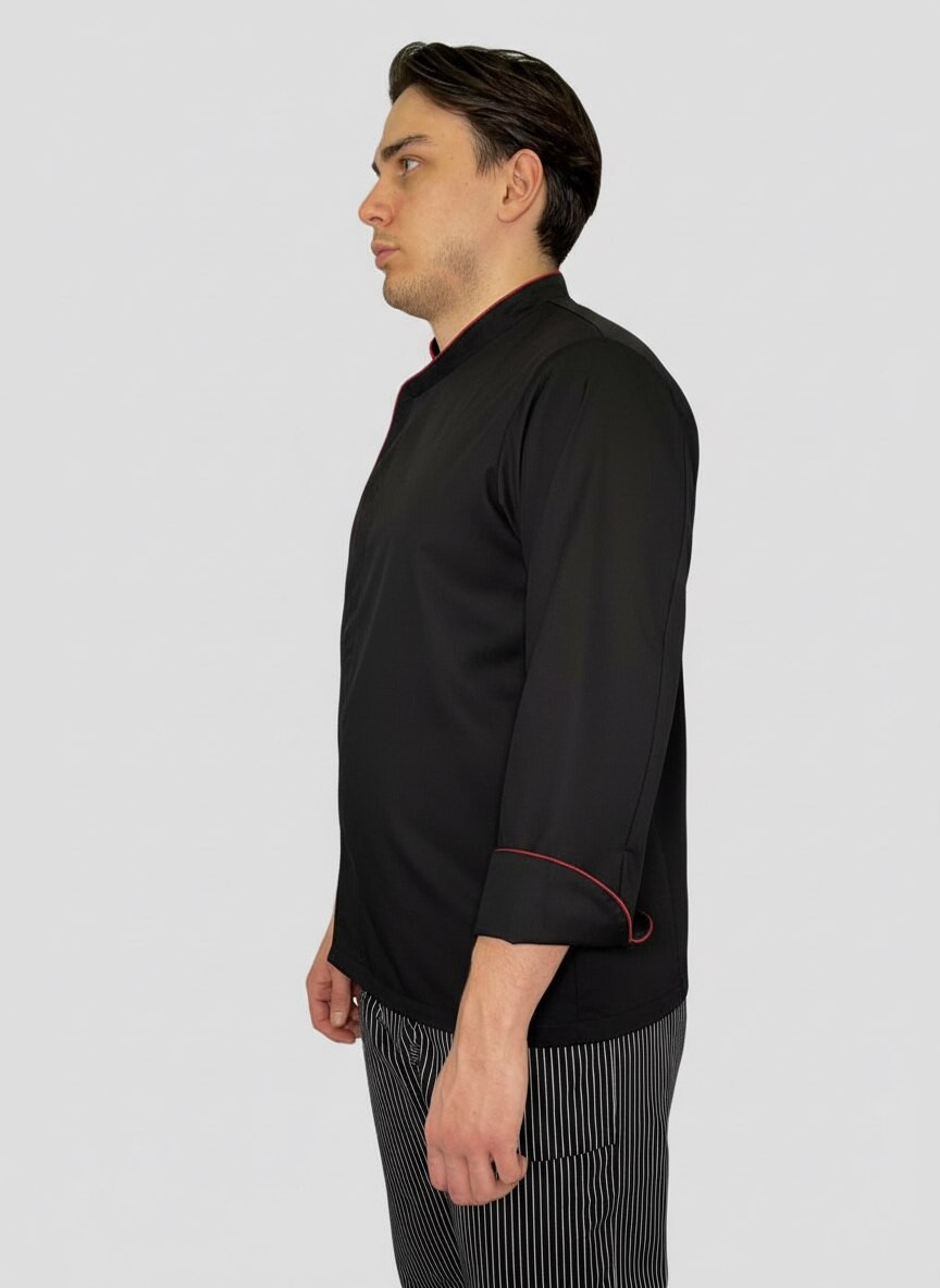 Куртка поварская, застежка на кнопках, длинный рукав, кант бордового цвета, спина сетка по рельефу. Ткань 50% полиэстер/50% хлопок.