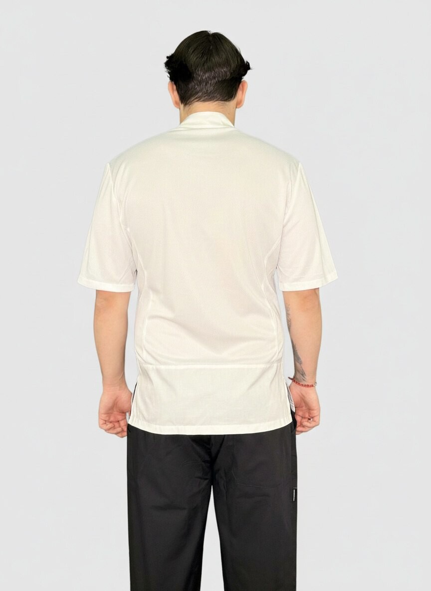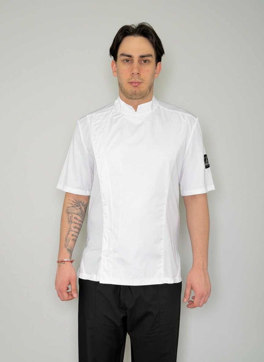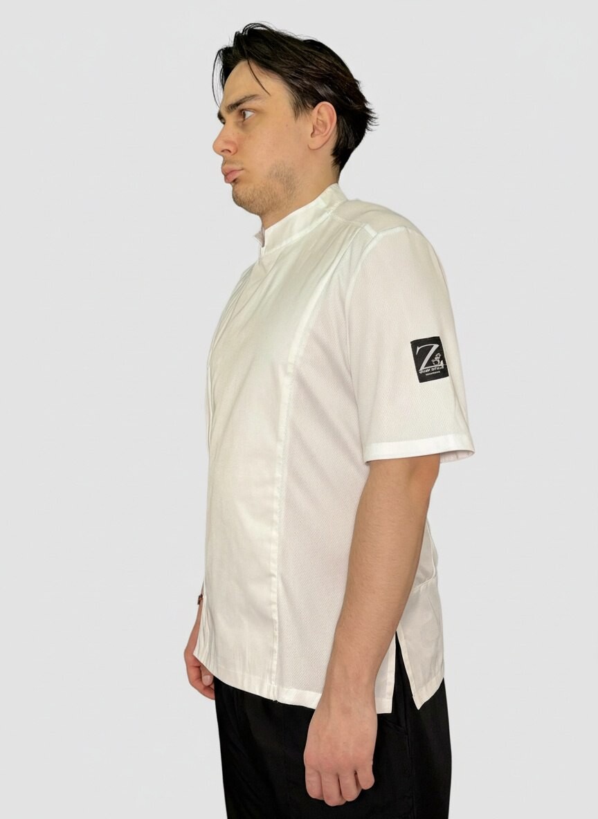 Куртка поварская, короткий рукав, застежка на кнопках, спина и рукава сетка трикотаж. Ткань: 50% хлопок/50% полиэстер.