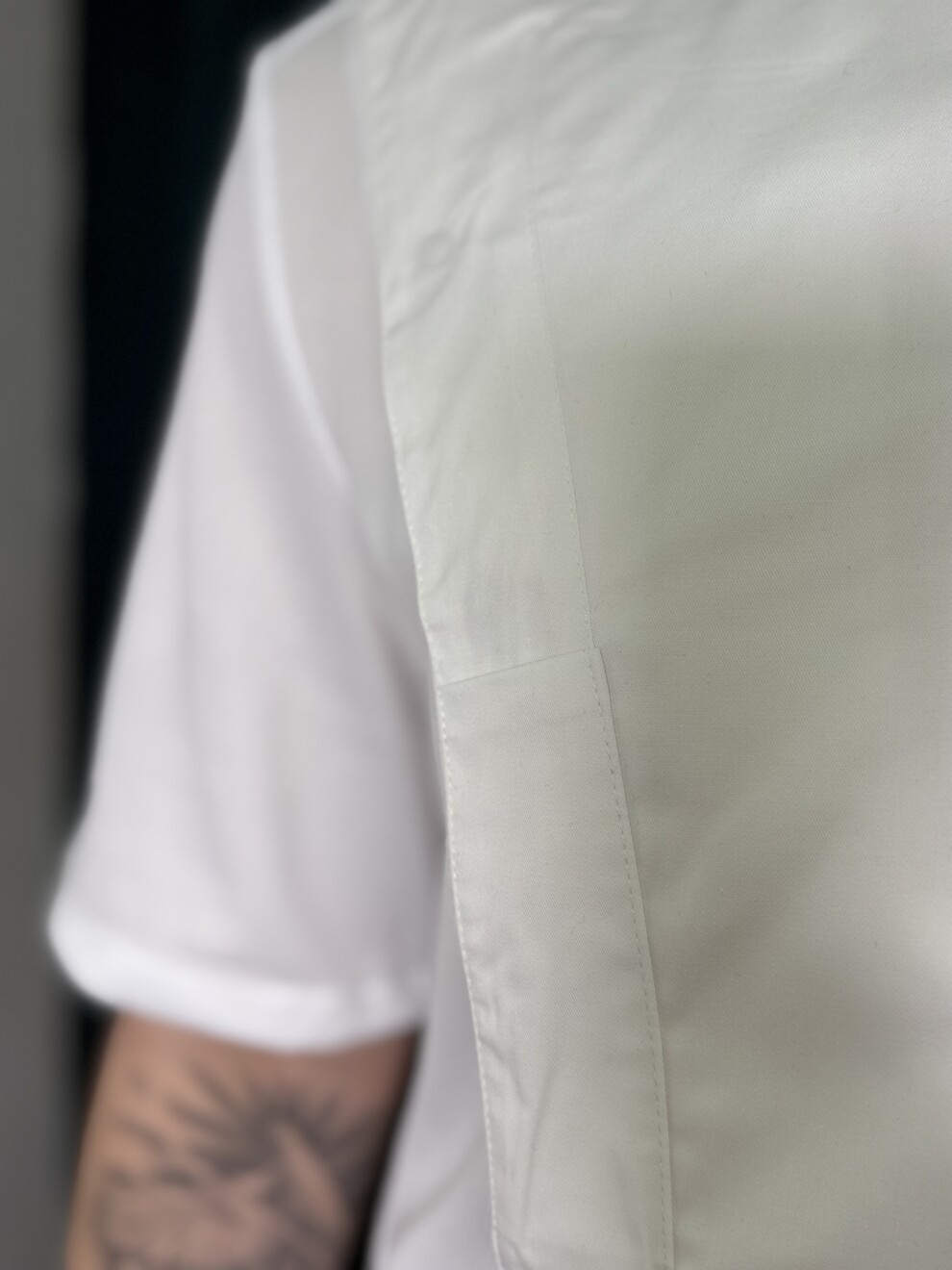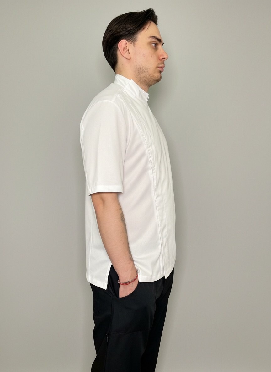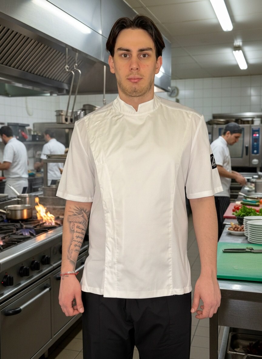 Куртка поварская, короткий рукав, застежка на кнопках, спина и рукава сетка трикотаж. Ткань: 50% хлопок/50% полиэстер.